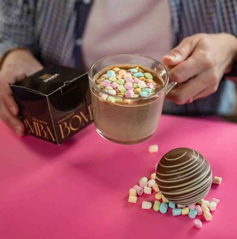 Objevte dokonalou harmonii čokoládového zážitku s naší Čokoládovou Bombou! Tento kulatý zázrak je vyroben z prvotřídní mléčné čokolády s jemnými akcenty bílé čokolády, které jí dodávají luxusní vzhled i chuť. Uvnitř vás čeká překvapení v podobě malých, měkoučkých kousků marshmallow, které se dokonale doladí chuť nápoje.