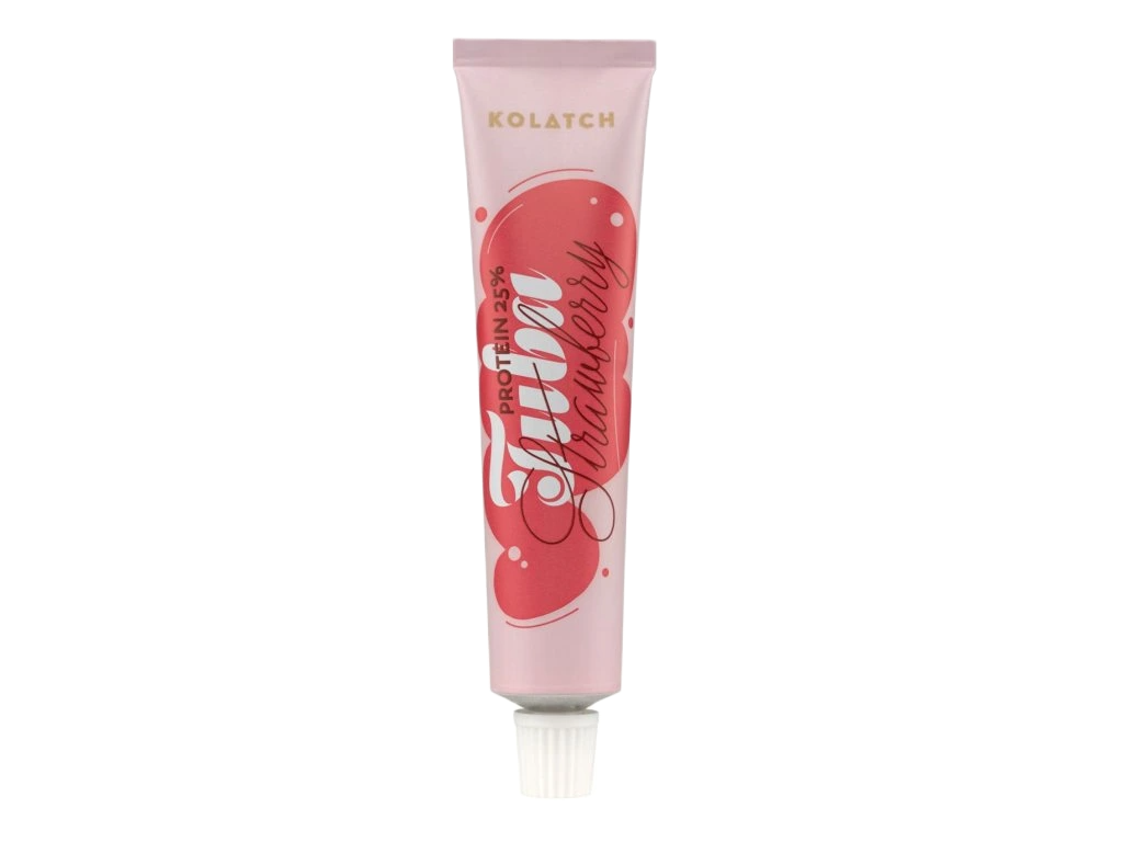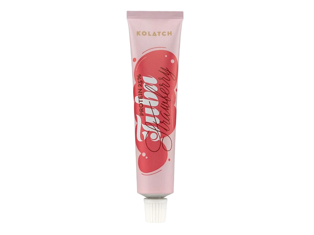 Složení: pražené mandle blanšírované, syrovátkový proteinový koncentrát (17 %), třtinový cukr, slunečnicový olej, jahodový prášek (4 %) (glukózový sirup, jahody, cukr, tapiokový škrob), kakaové máslo, sušené mléko plnotučné, emulgátor: slunečnicový lecitin, přírodní smetanová aroma, sůl. Výrobek může obsahovat sóju, arašídy a jiné ořechy.